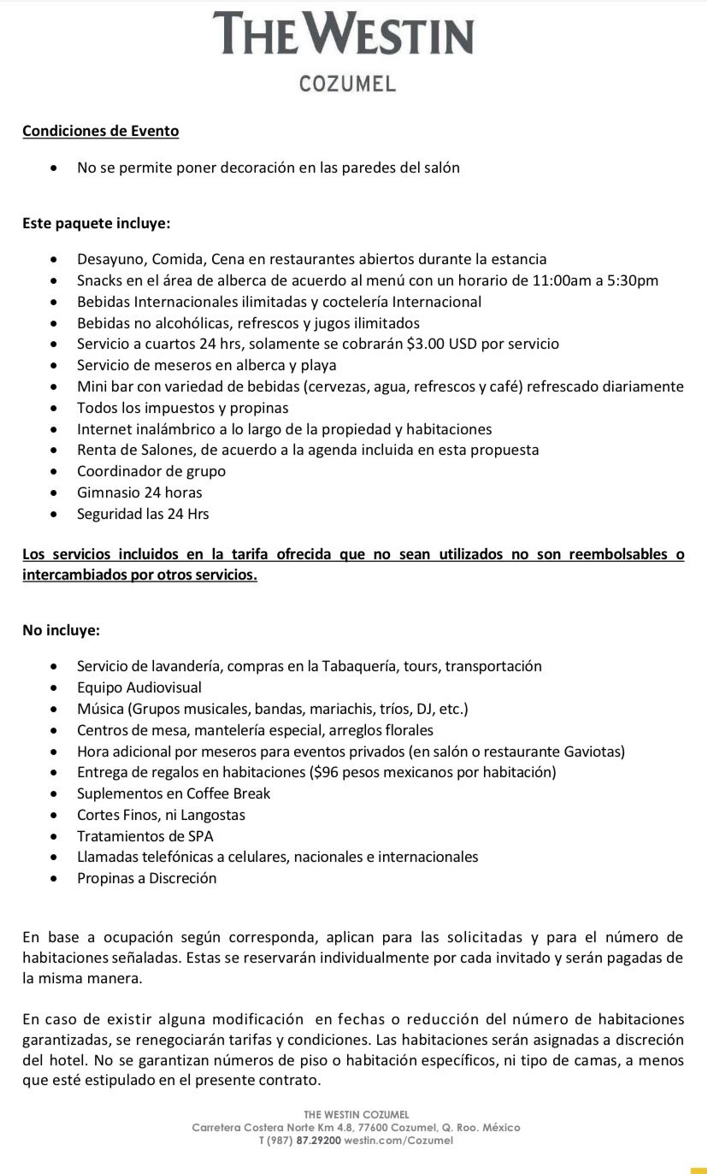 Roberto.uc@westincozumel.com. Se les pedirá una tarjeta de crédito como garantía. 13 días antes de la llegada, se cobrará el importe de una noche y el saldo restante se cobrará a la llegada de los clientes.